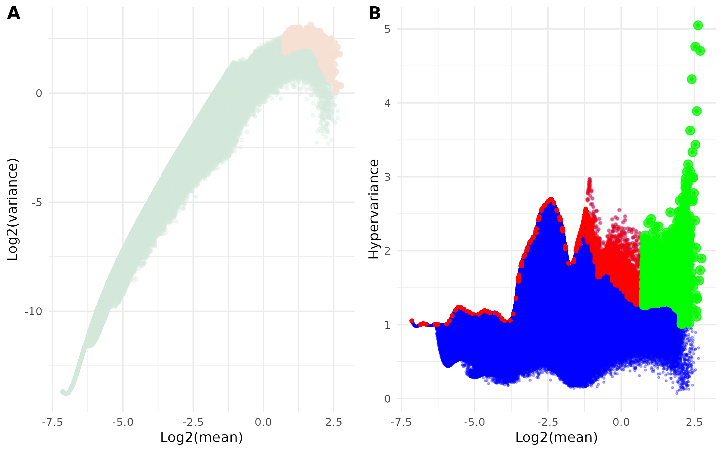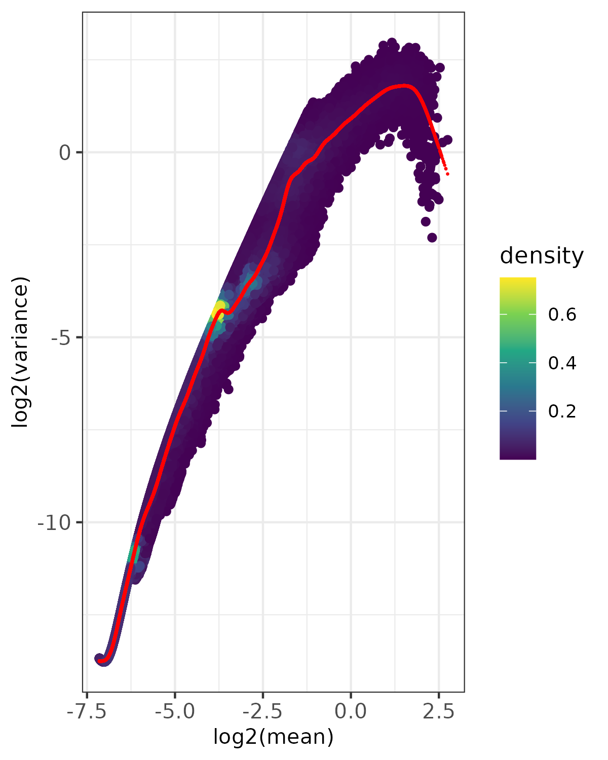 values divided by (n-1)log2_mean: Log2-transformed mean expressionlog2_var: Log2-transformed variancelog2_var_expected: Log2-transformed expected variance