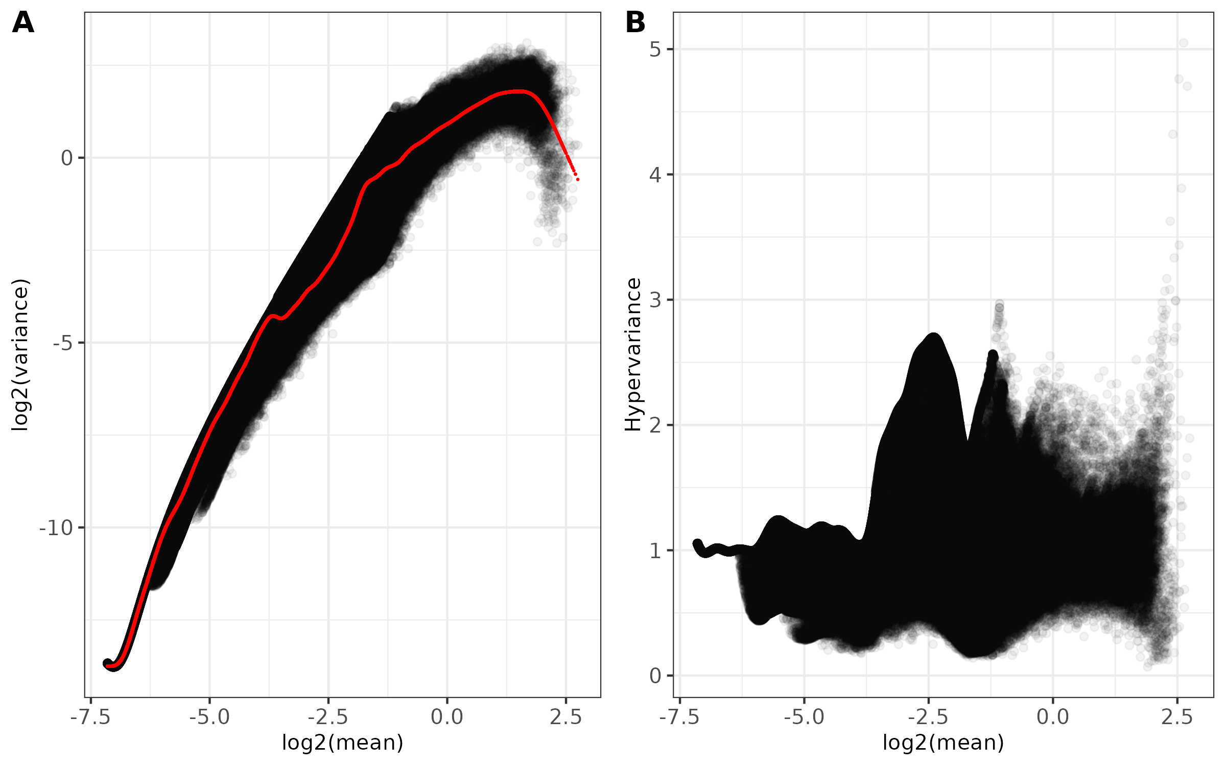 (Quantify overdispersion) Computes hypervariance metrics (sum of squared normalized values divided by degrees of freedom) for each feature. Higher hypervariance values indicate greater variability than expected from the mean-variance trend, signaling biological overdispersion rather than technical noise.